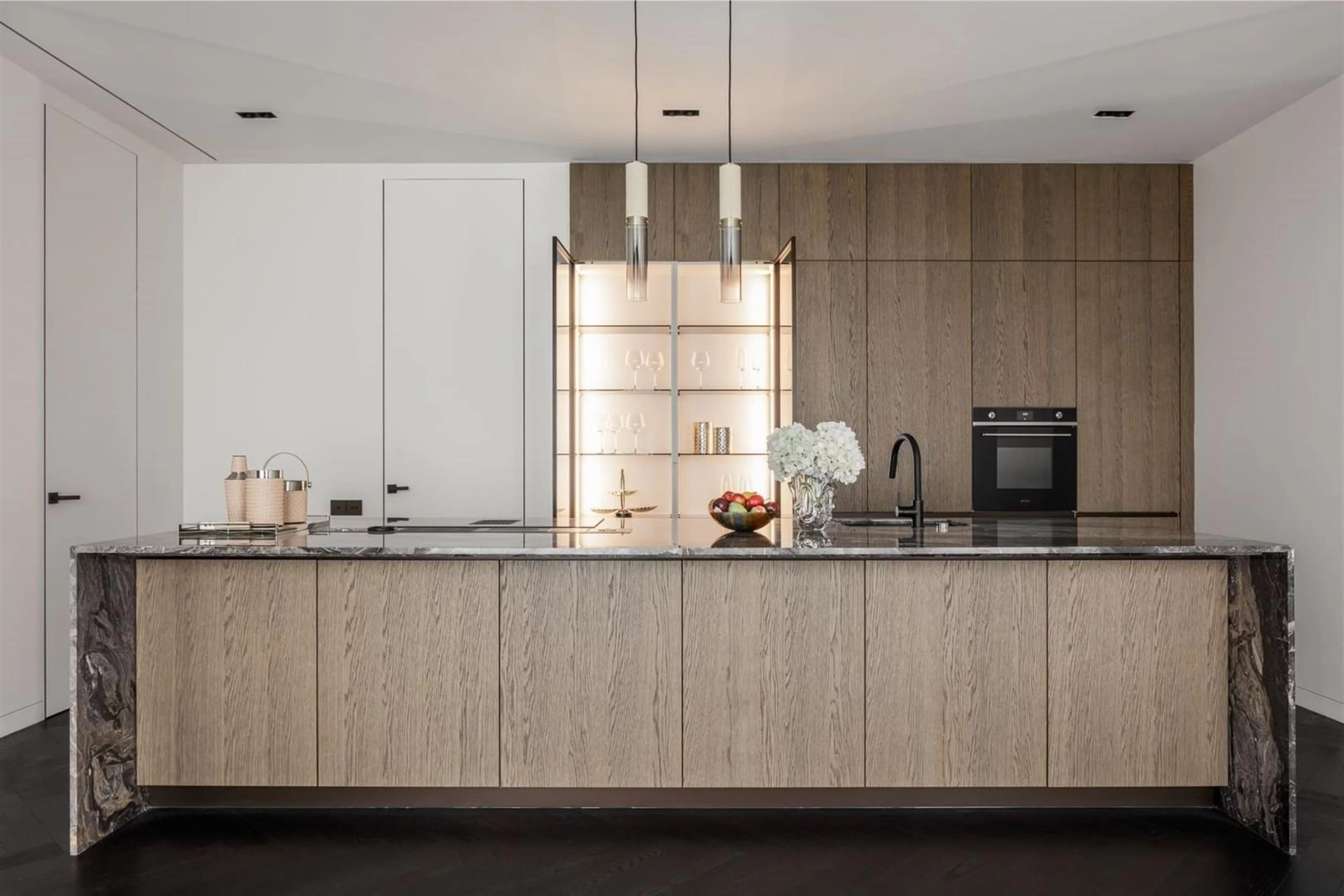 Для отделки кухни выбрана белая матовая краска THEIA. Это решение, где эстетика встречается с практичностью. Уникальная формула краски создаёт покрытие с благородной матовостью, которое легко переносит частое мытьё, не тускнея и не теряя вида. Кроме того, оно устойчиво к истиранию и активно противостоит въедливым кухонным запахам.