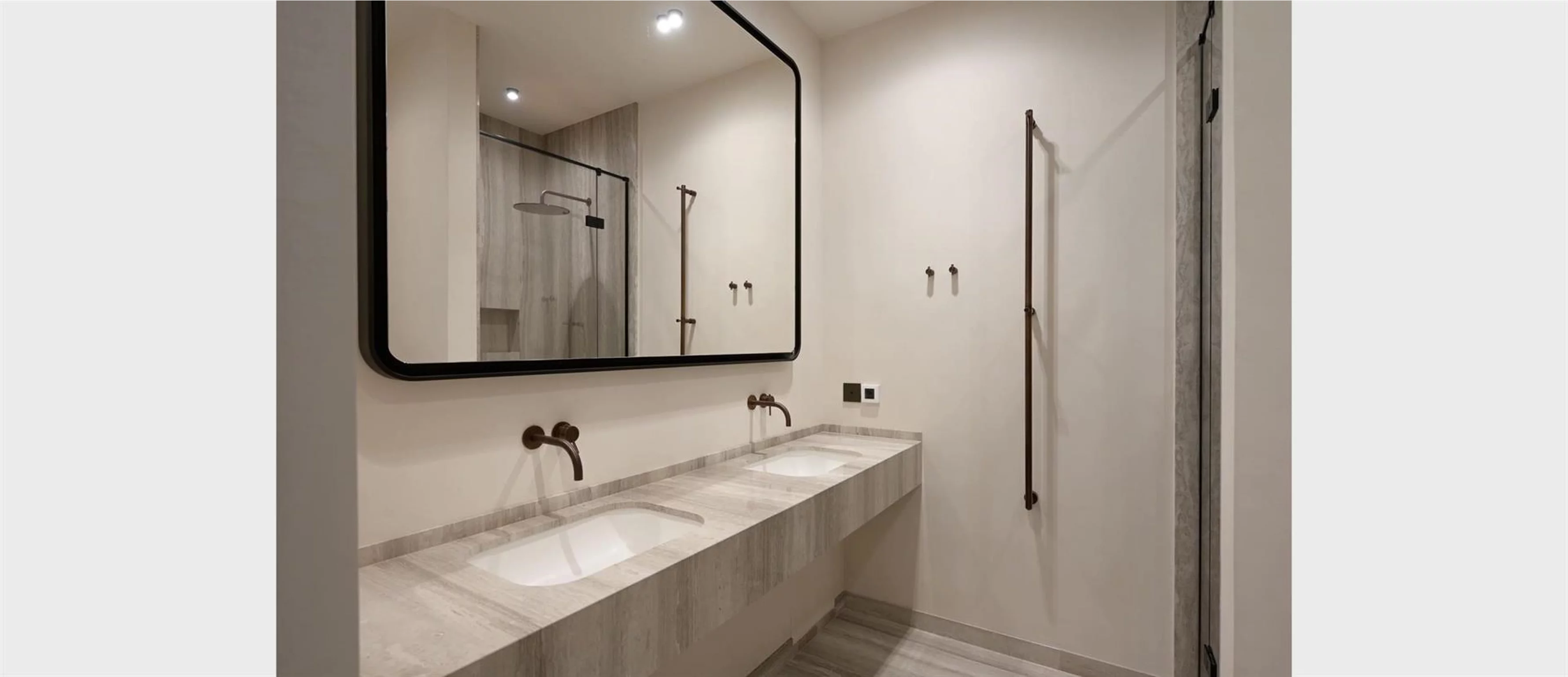 Стены в ванной комнате, в квартире премиум класса, в ЖК Тургенев, выполненные материалом Intonachino |