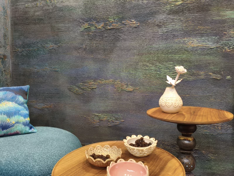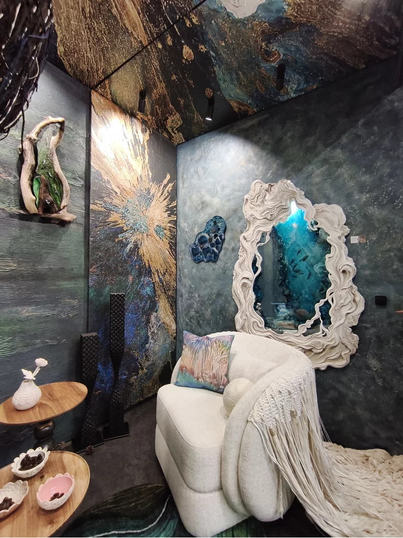 На втором стенде были представлены декоративные покрытия PRATTA ROCCIA и TRAVERTINO IMPERIUM с различными вариантами финишей. Организацию проекта осуществил московский офис PRATTA во главе с Юлией Винокуровой, а работу выполнил профессиональный мастер Аркадий (статус PRATTAMASTER).
